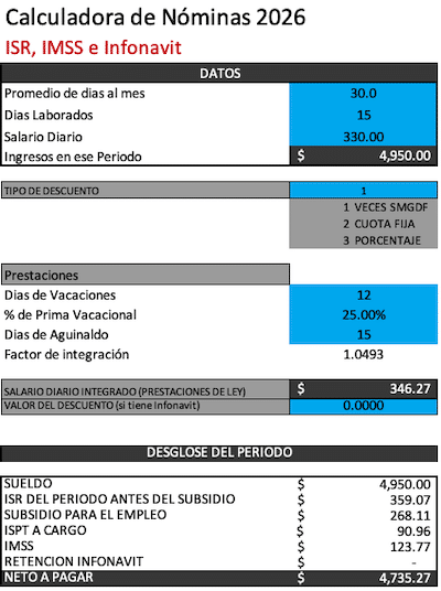 - Calcula automáticamente ISR, IMSS e Infonavit.