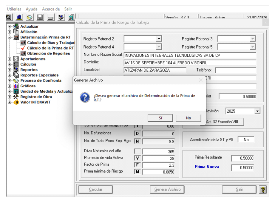 El sistema mostrará el mensaje: ¿Desea generar el archivo de Determinación de la Prima de RT? Pulsa Sí.