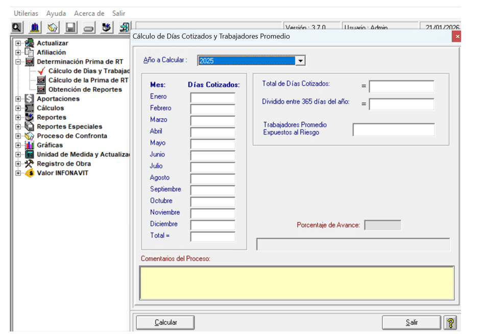 - Cálculo de días y trabajadores, donde el rubro Año a calcular se verifica que sea 2025. Pulsa el botón Calcular para obtener el total de días cotizados y los trabajadores promedio expuestos. Después, da clic en Salir.