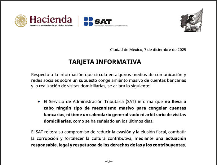 El Servicio de Administración Tributaria (SAT) informa a las y los contribuyentes que es falsa la información que ha circulado recientemente en algunos medios de comunicación y redes sociales sobre un supuesto congelamiento masivo de cuentas bancarias y la realización de visitas domiciliarias generalizadas. Esta noticia carece de sustento en la actuación institucional de esta autoridad.